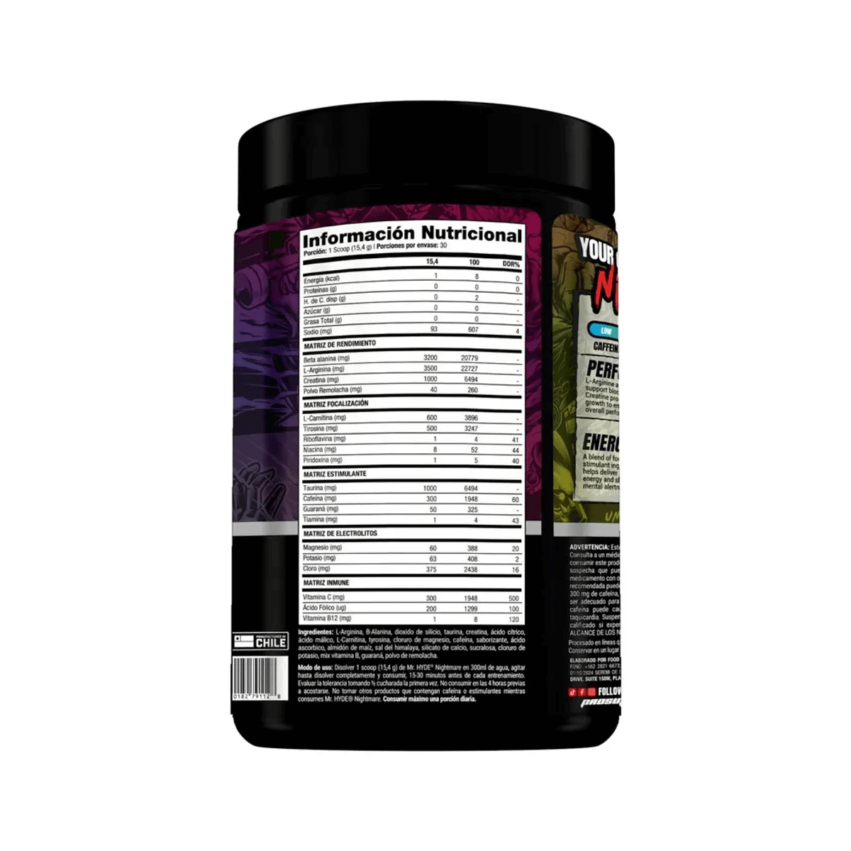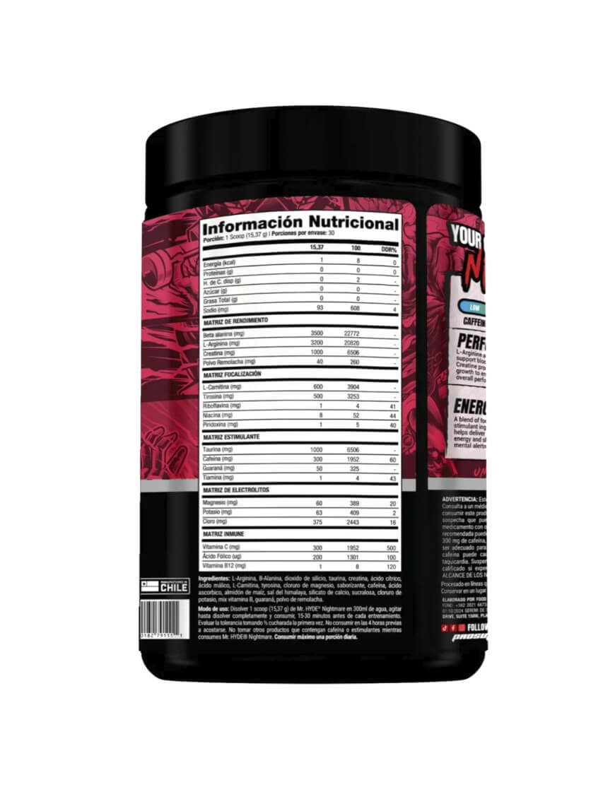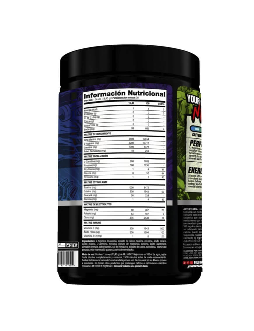 Mezcle 1 cucharada medidora de HYDE® Nightmare con 6-8 oz de agua. Consuma el producto de 15 a 30 minutos antes del entrenamiento o la competencia. Evalúe la tolerancia tomando 1/2 cucharada medidora la primera vez. No consuma el producto dentro de las 4 horas antes de acostarse. No tome ningún otro producto que contenga cafeína o estimulantes mientras toma HYDE® Nightmare